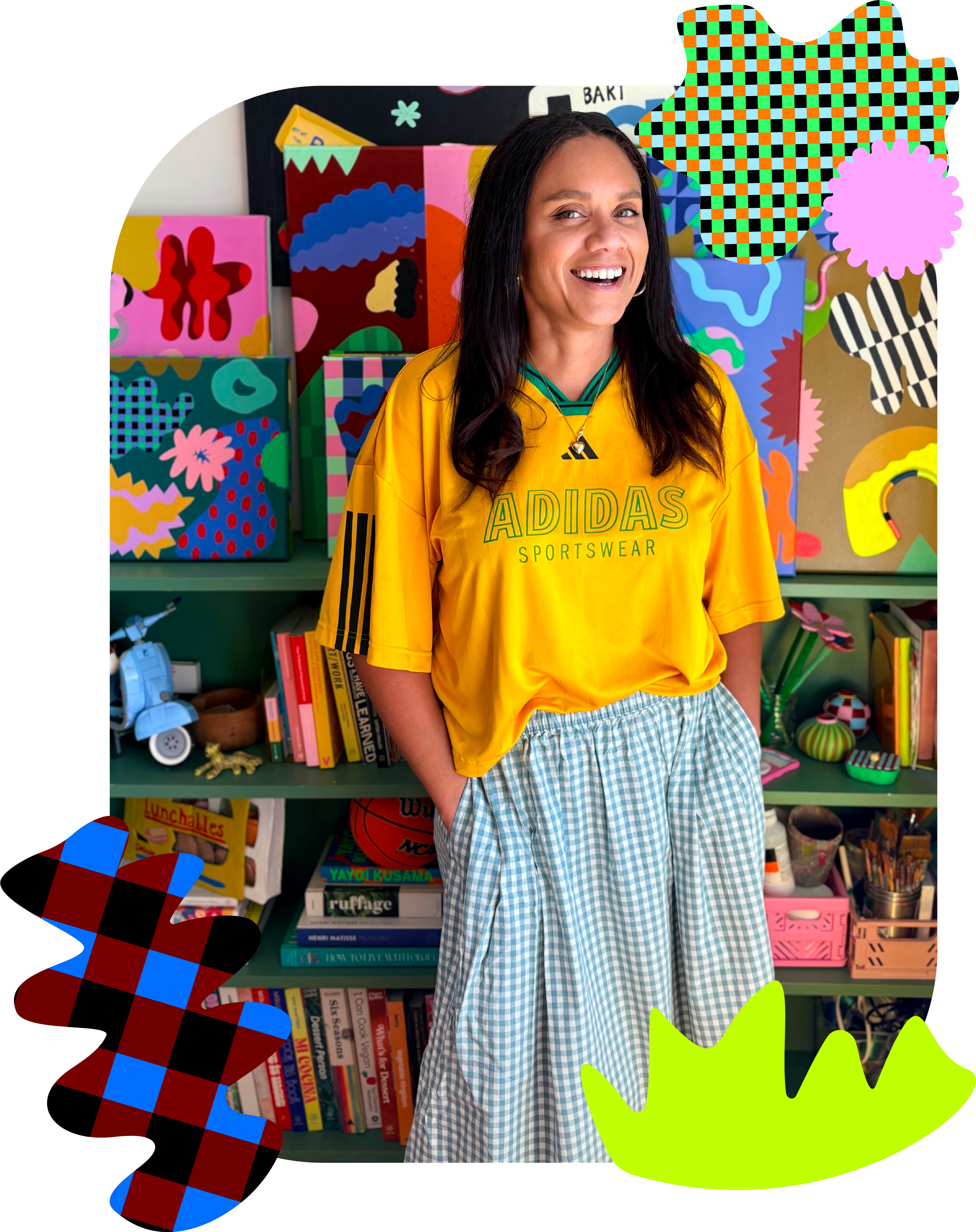Caitlin dabbles in just about everything from painting, to embroidery, fabric dying, paper mache, to colorful shaggy yarn. Always pushing the boundaries of traditional materials, Caitlin creates art that dances with the unconventional, drawing inspiration from the whimsy of life, the allure of textures, and a kaleidoscope of bright colors. The inner child being a pivotal theme throughout, Caitlin’s work is meant to be fun, light hearted and a treat for your senses.